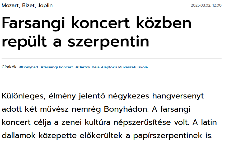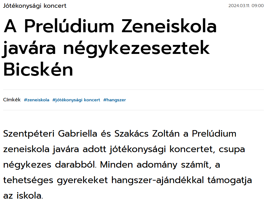 Koncerttermi kétzongorás és négykezes estek mellett igény szerint jótékonysági hangversenyeket is vállalunk iskolák, oktatási intézmények javára, műismertetéssel.
